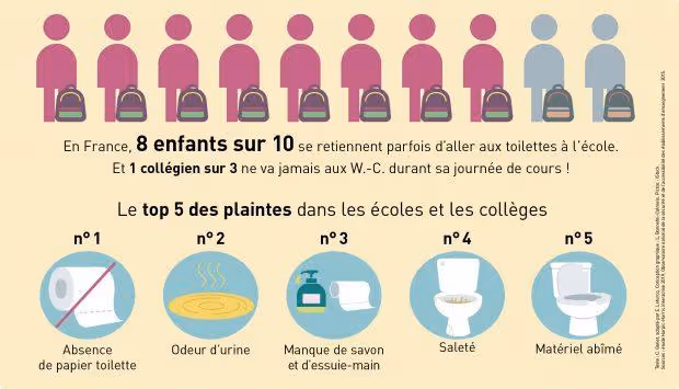 En 2019, une étude (voir ci-dessous) illustrait la réalité des toilettes scolaires. Ainsi 80% des écoliers se retiennent d’aller aux toilettes à l’école. Il en résulte des conséquences sur leur bien-être, qui peuvent nuire à leur concentration et plus largement à leur santé.